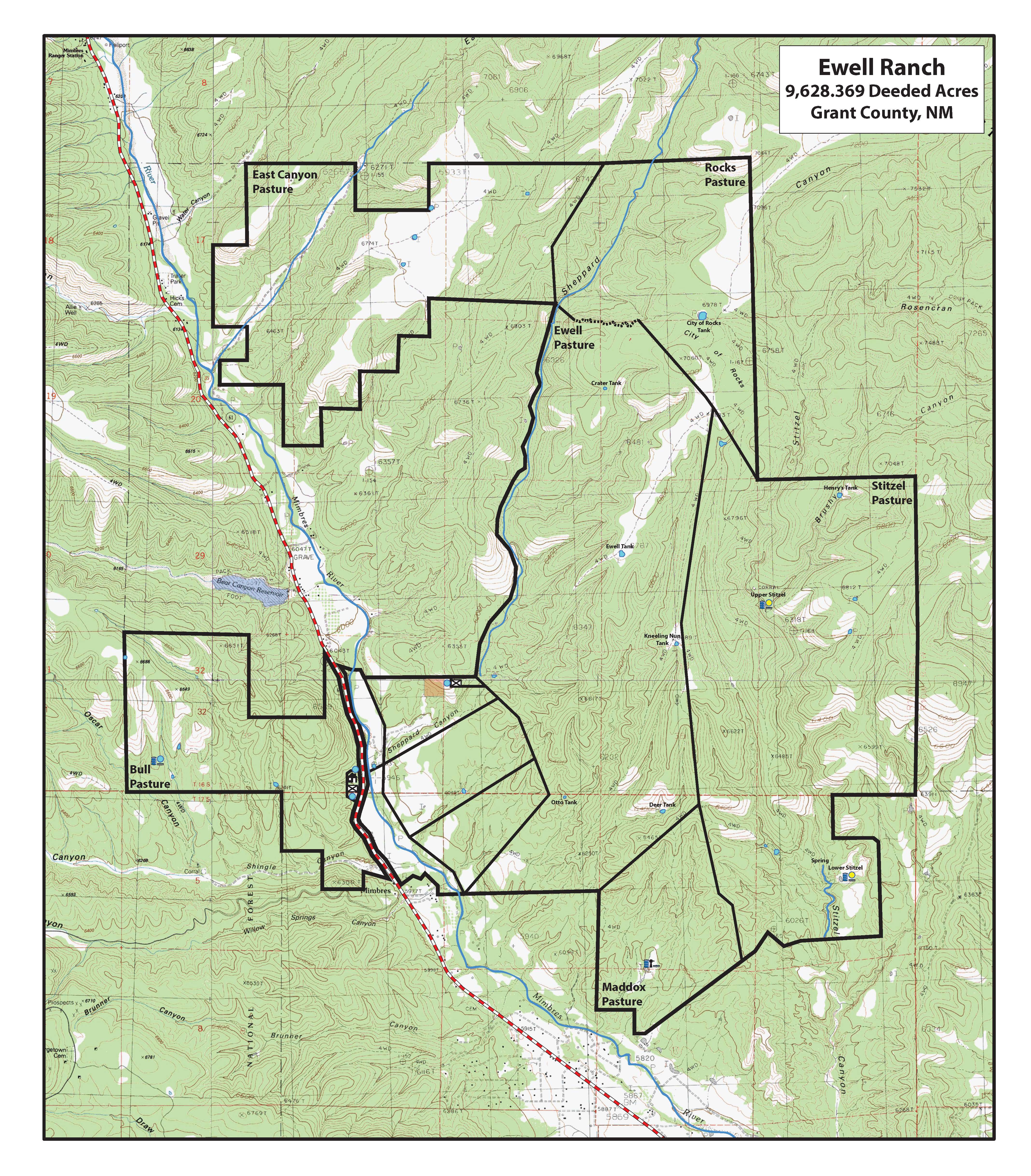 In addition to the Mimbres and several seasonal creeks traversing the ranch, other water sources consist of windmills, solar wells, and earth stock tanks. Seasonal live water is found in Sheppard and Stitzel Canyons. There are several storage tanks located in pastures to assure year round water for both livestock and wildlife. A minor amount of pipeline assists in water distribution on the ranch's northern pastures. Clearly a water system consisting of live water with ample back up via wells and stock tanks provides an owner minimal concern and cost in water system maintenance.