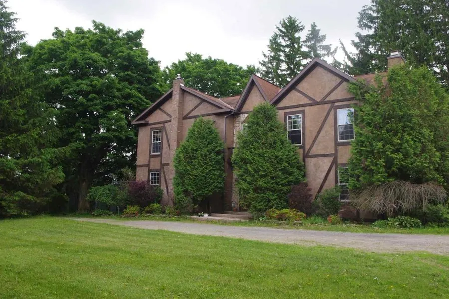 Outside, the rich and opulent colonial appearance of the interior gives way to a more European feel, with stuccoed walls and exposed exterior beams. The home is hidden in its own tiny forest of gigantic spruce and maple trees, with cedars interspersed in places. It has a brand new roof. There is a 20x30 3 car garage. You will find a 12x28 shed (old) and 2 sections of lawn enclosed by chain link fences to make it dog safe. There is also a 12x66 concrete pad where a trailer once stood. It has its own septic.