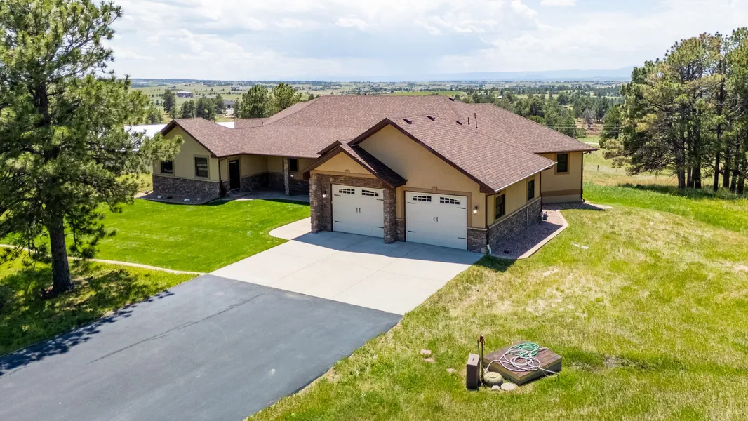 The modern Stucco and Rock home boasts 7,126 total square feet with 6,841 square feet of finished living area. It boasts high quality 26 construction and is set in the pines with an incomparable view of Parker and the front range mountains. With four large bedrooms, and four full bath rooms, and an open floor plan design, the home is wonderfully designed. The large living area, and main level bedrooms are situated to take in the views of the Rocky Mountains from large picture windows. The living room walks out onto the large all weather Trex deck to the west. The kitchen featuring granite counters, Knotty Alder cabinets and stainless appliances is open to the living and dining areas. The home features a large executive office with plenty of Knotty Alder cabinet storage and built-ins and an exterior entrance. The home features a new roof. The walkout basement features quality ICF Construction and includes two large bedrooms, a family room and theater or workout room.