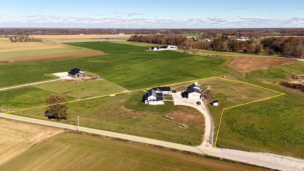 Discover one of the most picturesque settings in Southern Indiana with this 5.42-acre Amish-built homestead, ideally located less than 10 miles from the Charlestown Landing Rd/IN-62 interchange. This property perfectly blends traditional craftsmanship and modern convenience, featuring an expansive farmhouse, multiple outbuildings, and well-designed outdoor spaces for sustainable living. The 4,360 sq. ft. farmhouse offers spacious, open-concept living with a well-equipped kitchen, dining, and living area. Extensive hickory cabinetry, a corner pantry, and quality 2x6 stick-frame construction with spray foam insulation create an efficient and inviting space. The home is warmed by a wood-burning stove in the basement, while over 1,000 sq. ft. of covered porch space, complete with a charming porch swing nook, provides ample outdoor living options. The 2,800 sq. ft. poured-wall basement with 10-foot ceilings offers substantial room for future expansion. This homestead also boasts an impressive network of outbuildings to meet various needs, including a 2,400 sq. ft. pole barn with 1,600 sq. ft. of event space, an 800 sq. ft. apartment, and a spacious attic with exterior access. A 2,000 sq. ft. barn with four stalls, a tack room, 10-foot lean-tos on each side, and 12-foot Ag doors provide versatile storage and functionality.Additionally, a 900 sq. ft. insulated workshop with radiant floor heat is perfect for woodworking or an at-home business. Connected to a municipal water supply and an extensive sand-lined septic system, this property has access to rural electric, internet, and cable options along its nearly 550 feet of paved county road frontage. Approximately 3.5 fenced acres are divided into multiple paddocks, making this property ideal for small-scale farming or an active homestead. Experience this quintessential Southern Indiana property's charm, functionality, and sustainabilityperfect for those seeking a beautiful, self-sufficient lifestyle.