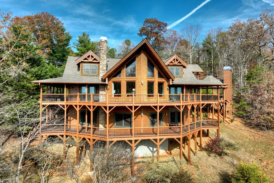 Experience the timeless charm of a true log home, perfectly designed with a prow front and expansive windows that showcase breathtaking year-round layered mountain views. Meticulously maintained by its one and only owner, this home exudes quality craftsmanship and thoughtful design, nestled on over four private acres just five minutes from McCaysville and fifteen minutes from downtown Blue Ridge. Main level features engineered hardwood floors, soaring ceilings with exposed beams, and abundant natural light that highlights the detailed hand-hewn logs and rock accent walls. The living area centers around a striking rock fireplace, while the open kitchen boasts granite countertops, custom cabinetry, gas cooktop, and stainless steel appliances, with an adjoining breakfast area for casual dining. A laundry/mudroom provides convenience, and the half bath adds a rustic touch with its unique tree stump vanity. The master suite offers stunning mountain views and a luxurious ensuite bath complete with a jetted tub, tile shower, double vanity and brand-new glass shower panels, quartz countertops, updated light fixtures. The open staircase leads to the upper level, where a loft area serves as a second living space with panoramic views. three versatile bedrooms provide options for a home office, bunk room, or guest accommodations, complemented by a full bathroom with a soaking tub and private water closet. The partially finished basement includes a spacious living room/game room with an unvented gas log fireplace, a full bathroom, and a fifth bedroom with oversized closet. The unfinished space, which is AC-controlled, is perfect for a workshop and offers direct access to the one-car garage. Outdoor living is a dream with a wrap-around porch, two levels of decks, and a beautifully landscaped yard. A cozy gazebo w/wood-burning outdoor fp adds to the allure of this mountain retreat.Perfect for full-time living or as a luxurious getaway, this home seamlessly blends rustic charm with modern amenities.