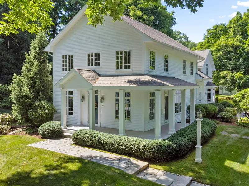 Surrounded by stonewalls, plush gardens, and majestic trees, this meticulous home with its wrap-around porch, clean lines, and square columns is an early twentieth century home reimagined. Situated in the heart of Westborough, it offers transom windows bright with natural light, hardwood floors with inlay accents, custom cherry cabinetry, and beautiful sunsets. Open the front door and step into an inviting living room setting that flows into a formal dining room. The first floor also includes a corner office, a guest suite, and a gourmet kitchen with Miele appliances, granite countertops, and tumbled marble backsplash. An adjacent dining area offers views of the patio and garden beyond and overlooks the spacious family room complete with gas fireplace and walk-out bay window. Adding to its distinctive quality, this home has a front and back staircase to the second floor where resides three bedrooms at the front of the house and a primary suite at the back with a skylighted loft, a fitness area, and laundry room between them. The updated basement offers even more room for storage and recreation. Well-built, this distinctive home is a home reimagined!