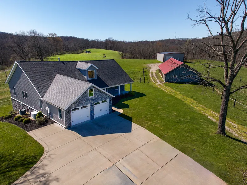 Escape to the tranquility of this pristine 44.56-acre farm nestled in the heart of Ritchie County, West Virginia. Beyond the stone gated entrance, a picturesque scene unfolds as you traverse down the concrete drive, leading to the masterfully crafted stone home that serves as the centerpiece of this idyllic property. Step into the grandeur of the main living room, adorned with an exquisite Austrian Swarovski chandelier, real hickory hardwood floors, and a double-sided gas fireplace that seamlessly divides the space and kitchen. The culinary enthusiast will delight in the kitchen's elegance, boasting beautiful quartz countertops, stainless steel appliances, a double oven, gas cooktop, and walnut cabinets. Adjacent to the kitchen, an elegant dining room, illuminated by a tray-lit ceiling, offers ample space for gatherings with loved ones. Extend your living space outdoors onto the covered balcony overlooking the rolling pasture landa perfect setting for outside dining, equipped with a gas port for grilling and ceiling fans for comfort. Retreat to the spacious and cozy primary bedroom, complete with a tray-lit ceiling and two walk-in closets featuring walnut shelving. The ensuite primary bath beckons with its luxurious amenities, including a heated tub strategically positioned to provide breathtaking views of the horse barn and pasture, a spacious glass door shower, double sinks, quartz countertops, and walnut cabinets. Descend into the lower level, where another living room or bonus room awaits, featuring a fridge, quartz bar, and radiant floor heatinga perfect space for relaxation and entertainment. Stay active in the workout room, complete with built-in walnut shelving for storage and a built-in desk for added convenience. Never worry about losing power in the house or having to fuel the whole house generator, as it is piped directly into the free gas that is available on the property. The two-stall garage offers heated flooring, ensuring comfort year-round. Outdoors, the horse barn stands as a testament to equine luxury, with four 16x12 stalls boasting stunning European stall fronts and heated Nelson waterers. Additional features include a heated wash bay, spacious tack room with one cedar wall with six mounted saddle racks, additional saddle pad racks, and adjacent bridle hooks, gas heat, sink, cabinetry, and a bathroom. A heavily insulated 40x60 steel building provides ample space for storing farming equipment and supplies. The property also boasts approximately 15.5 acres of lush pasture ground and hay fields, enclosed by high-tensile and ribbon fencing, along with a small pond and a trail installed for many horseback rides. Ample deer and turkey are spread throughout the property, offering lots of great hunting opportunities. Or take advantage of day ride opportunities off the farm locally at Wayne National Forest, North Bend State Park or the Rails to Trails with convenient trailer parking right in Ellenboro. With its captivating ridge-top views, this property offers a rare opportunity to embrace the beauty and tranquility of rural living in style.