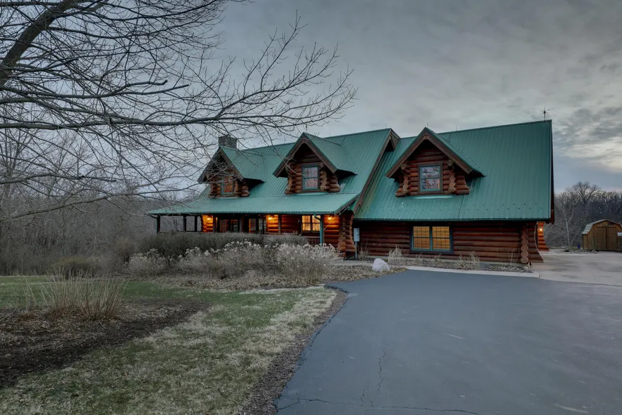 Experience the allure of this exquisite log home, meticulously crafted in 1991 and nestled on a sprawling 11-acre wooded estate. The grand lodge boasts a captivating architectural design, featuring a 2-story living room adorned with a magnificent river stone fireplace and a loft area that overlooks the inviting space. Revel in the abundance of natural light, thanks to the vaulted ceilings that create an open, airy ambiance. The primary suite offers a sanctuary of comfort and style, embodying the essence of luxury living. The custom kitchen boasts stainless steel appliances and stone countertops along with optimal space to create enticing meals and entertain family and friends. A fully finished walk-out basement presents a versatile living space, recreational room, and an additional non-confirming bedroom for added functionality. Immerse yourself in the tranquility of the surroundings, ac...