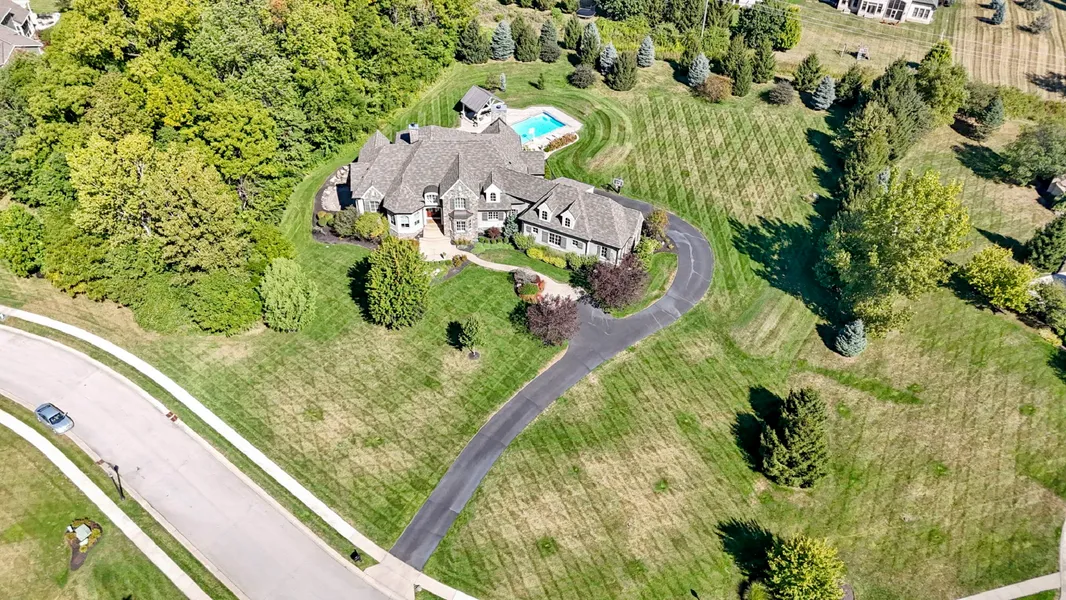 Perfectly sited on just over two acres, this extraordinary estate, crafted by renowned builder Brad Bowman of Homes by Design, embodies timeless architecture, impeccable craftsmanship, and sophisticated design. From the limestone accents framing the stately entry to the meticulous millwork that defines each room, every element of this home was meticulously curated to achieve a blend of luxury and comfort. The heart of the home is an awe-inspiring central gathering space featuring 22-foot vaulted ceilings adorned with hand-hewn beams, a dramatic stone fireplace, and seamless flow between the expansive kitchen, hearth room, and casual dining area. The chef's kitchen is a true showpiece, offering dual islands, professional-grade appliances, including double ovens, a 48" range, a warming drawer, and a spacious walk-in pantry designed for both function and style. The main-level primary suite is an exquisite retreat, showcasing vaulted ceilings, beams, and a spa-inspired bath with heated floors, an oversized walk-in shower, and a magnificent closet boasting 14-foot ceilings. Upstairs, three additional ensuite bedrooms, each with walk-in closets, extend to a large, inviting loft enhanced with custom built-ins, providing an ideal space for a kids' retreat. The walkout lower level extends the home's livable luxury, featuring a fifth ensuite bedroom, a private exercise room, game and theater spaces, and an expansive entertainment area with a full bar and fireplace, perfect for hosting on any scale. Abundant windows invite natural light throughout and frame views of the resort-like backyard oasis, complete with an expansive covered porch, a saltwater gunite pool, and an elegant pool pavilion, offering the perfect backdrop for outdoor living and entertaining. Every inch of this home reflects thoughtful design and enduring quality, creating an atmosphere of understated elegance and effortless sophistication.