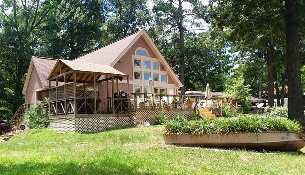 Extraordinary furnished 3 BR/3BTH waterfront 1669 SF story and a half cottage/chalet on Lake Striker in Jacksonville, Tx. Built in 2006 and perfect for entertaining. Comes with 1995 Beachcomber 24' pontoon boat and boathouse with electric lift. Newly painted interior, multiple decks for entertaining. Hot tub included. Sprinkler system with pump via lake water. Fenced half acre lot. Home comes furnished with bright and cheery beach themed colors and rooms. All furnishings convey, including bedding, patio furniture, etc. Gas fireplace with blower, washer, dryer, gas stove, refrigerator, dishwasher, garbage disposal, bedrooms with bedding, numerous tv's, patio furniture, and more. Master bedroom w/bath and guest bedroom w/bath downstairs. Upstairs has landing, large guest bedroom and large bath. Storage bld and aerobic septic. Must see. Will not last long. Call Susan today! All you need is to walk in and start enjoying today!