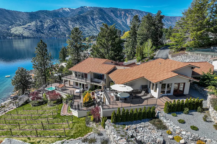 An extraordinary Tuscan-inspired waterfront villa nestled on the coveted North Shore of Lake Chelan. Sited on a beautifully manicured near half-acre, this bespoke estate captures sweeping views of the lake and surrounding mountains. Spanning 3,847 square feet, the residence features 4 bedrooms—including two luxe primary suites—and 4 baths, all reimagined in a comprehensive, studs-up renovation in 2022. Designed for effortless entertaining and tranquil retreat, the home’s vaulted great room showcases rustic wood beams, a designer kitchen, and expansive dining and living areas. Bi-folding glass doors open wide to reveal layered terraces, a spa perched above your private vineyard with Chardonnay and Cabernet vines, and a brand-new dock.