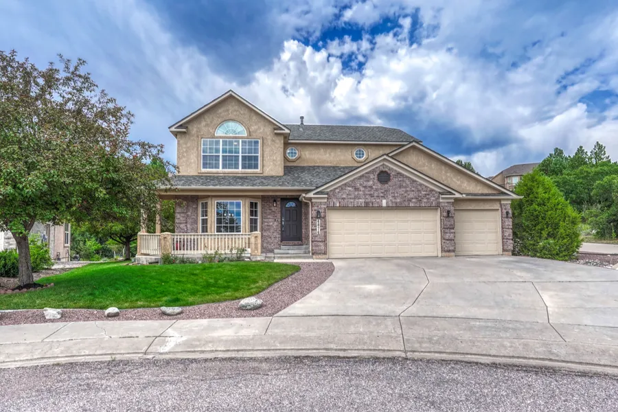 Fabulous 5-Bedroom Home in Sought-After University Bluffs! This beautifully updated 2-story with finished basement offers 5 conforming bedrooms, 4 bathrooms, a separate office, and a spacious finished 3-car garage with storage and service door. Set on a quiet cul-de-sac, this stucco home backs to open space for privacy and natural views. Inside, enjoy 3,744 sq ft of living space with modern finishes throughout. The bright main level features LVP flooring, an open living/dining area, a gas fireplace in the great room, and a dedicated office with French doors. The remodeled kitchen offers white cabinetry, quartz counters, stainless appliances, a gas range, and direct access to a composite deck overlooking the wooded backdrop. Upstairs, the primary suite boasts a large walk-in closet and 5-piece bath with soaking tub, dual vanities, and separate shower. Three additional bedrooms share a stylish full bath with double sinks. The finished basement includes a large rec room, wet bar with full fridge, oversized bedroom, ¾ bath, and ample storage. Additional highlights: 2022 updates, newer furnace and water heater, carpet upstairs and basement, and tile in all baths. Outdoor features include a river rock bed, tree-lined yard, and trails within 300 yards. Just minutes to UCCS, University Village shopping, medical centers, and I-25 with easy access to Downtown and the Air Force Academy. Low-turnover neighborhood of custom homes makes this an exceptional find!