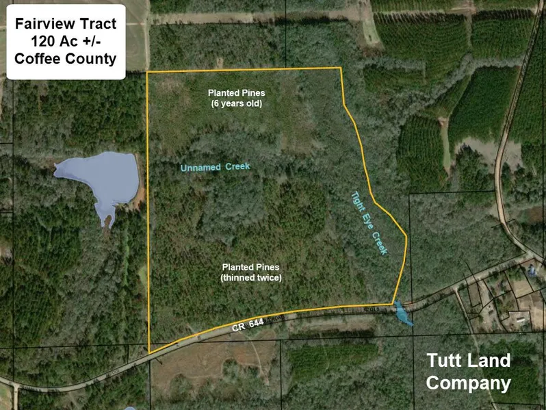 The Fairview Tract is 120 acres in southwest Coffee County featuring mature hardwoods, planted pines, two year-round creeks, and paved road frontage. This multi-use property has merchantable timber, outstanding deer and turkey hunting, and is exceptionally well suited for a country home site or hunting camp. Conveniently located less than 12 miles from the Boll Weevil Circle (Hwy 84 Bypass) in Enterprise, this tract is surrounded by large timber tracts and farmland. The terrain is level to gently rolling with one creek running east-west through the middle and the other creek flowing north to south on the east. It has almost a half-mile of paved road frontage with power and county water available at the road. This is a high-quality tract that offers great hunting and any number of options on which to build.
