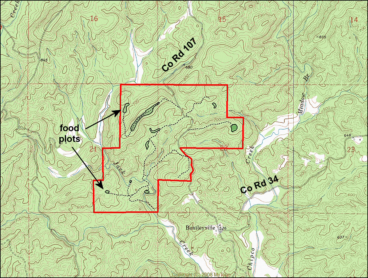 Take U S Hwy 231 south toward Rockford for 11.6 miles. Take a right on Co Rd 59 and go 1.2 miles. Take a right onto Co Rd 34 and go 3.3 miles (about half way to the next turn this road will turn from a paved surface to a dirt surface). Co Rd 34 will T with Co Rd 107 right in front of an old barn. Take a right on Co Rd 107 and go 0.5 miles to the south line of the property (property on the left). Look for the Cyprus Partners sign. There are five roads off of Co Rd 107 into the property. These are gated so call the agent for the combo. You are welcome to look on your own (download the brochure from the web site and use the topo map and aerial photo as a guide) or you can set up an appointment with the agent. The intersection of the south line and County Road 107 is located at Lat: 32 57 41.8 N.; Lon: 86 15 49.2 W.