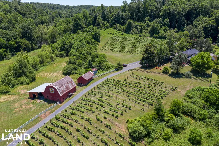 You'll love this spectacular farm with a beautiful home, many outbuildings, and opportunities for a primary or vacation residence, equestrian retreat, wedding venue, or to keep the wine-making tradition alive. The exceptional four-bedroom house has old-world charm and modern functionality and patios and decks look out over a landscape that is an ideal blend of flat and partially fenced pastures, rolling vineyards, water features, and private woodlands. Functional outbuildings include a two-car garage with a semi-finished loft, a heated/cooled workshop with a covered loading deck (currently used for wine production), a large barn with hay loft suitable for cattle and horses, a chicken house, two-grain bin/dryers, plus several other buildings. Two of the four bedrooms are temporarily used for winery guests, but direct access from the home is easily restored and they are included in the sqft. No drive-bys, appointment required. Winery equipment is negotiable but not included.
