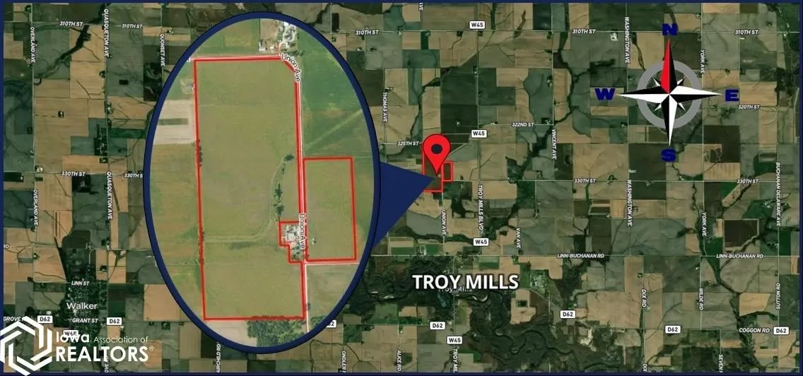 Located one mile north of Troy Mills, this 113-acre m/l property sits along 325th Street and Union Avenue with a CSR2 of 64.7. Has 111.84 acres m/l enrolled in CRP through 2026 at $279.60 per acre, or $31,270 per year. Easy access and steady contract income. It includes a grain bin and a garage. It would also make a great new building site if desired.