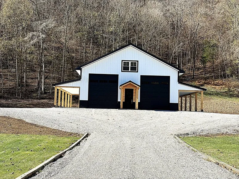 Beautiful newly built large barn on 10 unrestricted acres in South Central Kentucky. Barn is 40 x 50 x 16 with two 10 x 50 covered patios. Constructed with high quality materials that include 8 x 8 and 6 x 6 posts and beams all on 6-inch concrete High end Provia premium double hung windows and custom doors. Haas 12 x 14 insulated overhead doors with side mount openers. Interior includes 40ft wide clear span finished cathedral ceiling. 20ft wide gravel driveway that includes drive-around access to additional large gravel building sites on each side of barn. Secluded setting on a dead end paved road that is peaceful and quiet. Gorgeous mountain, valley, and creek views. Mature hardwood forests and excellent soil for homestead farming or large gardens. Multiple water sources include cold water mountain spring, large year-round creek, and county water. Electric and fiber internet on site....