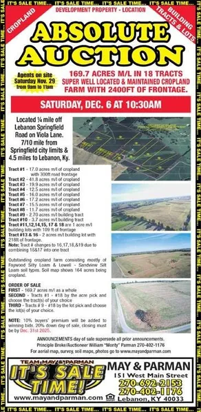 NOTE ACREAGE & TRACT CHANGES. TRACTS #16 & #17 HAVE BEEN COMBINED INTO ONE TRACT. ONLY 18 TRACTS NOW!! We are having an ABSOLUTE AUCTION on Dec 6th at 10:30am of a 169.7-acre m/l cropland farm with 2400ft of frontage located 1/4 mile off Lebanon-Springfield Rd on Viola Lane 7/10 mile from Springfield City Limits and 4.5 miles from Lebanon. Outstanding cropland farm consisting mostly of Faywood Silty Loam and Lowell-Sandview Silt Loam soil types. Tract #1 - 17 acres m/l, Tract #2 - 41.8 acres m/l, Tract #3 - 19.9 acres m/l, Tract #4 - 12.5 acres m/l, Tract #5 - 16. acres m/l, Tract #6 - 17.2 acres m/l, Tract #7 - 15.5 acres m/l, Tract #8 - 11.7 acres m/l, Tract #9 2.7 acres m/l, Tract #10 - 3.7 acres m/l, Tracts #11,12,14,15,16,17 &18 are 1 acres m/l building lots with 109ft of road frontage. Tract #13 - 2 acres m/l. Tract #16 2 acres m/l.