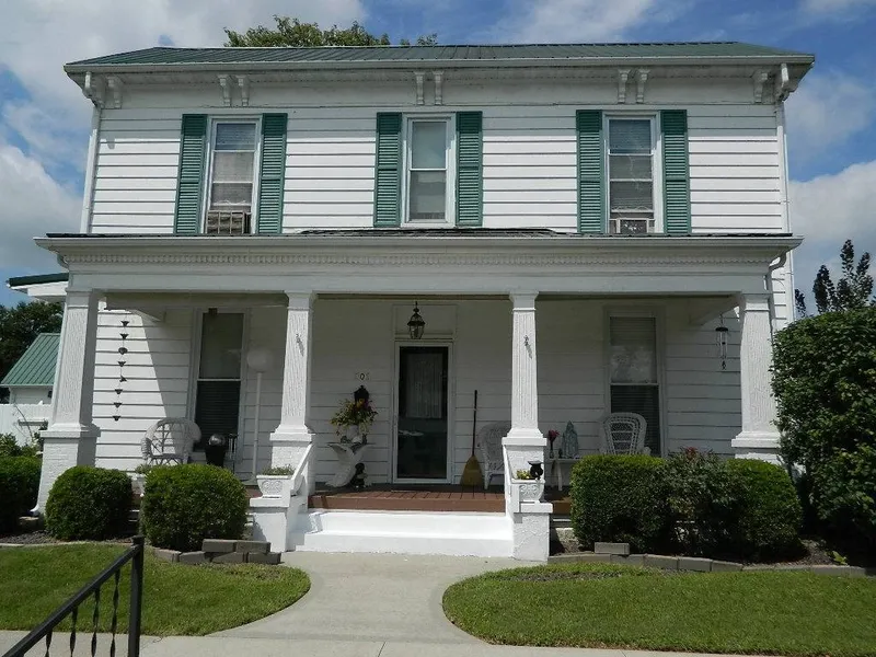 The home welcomes you with a covered front porch featuring low-maintenance composite wood flooring, while a cozy inset side porch with slate tile adds an extra touch of character. Inside, natural light pours through large windows, highlighting the beautiful hardwood floors. The main level includes a formal living room, a spacious great room, a functional kitchen, and a convenient main-floor bedroom. Upstairs, you'll find a second bedroom along with a spacious primary suite that boasts an oversized dressing room. Recent updates enhance the home's livability and value, including a durable metal roof (2013) and an enclosed carport converted into a garage (2013). The carriage house has also been reinforced with a new concrete foundation, providing ample storage space. Outdoors, the fenced backyard is a private retreat filled with mature trees and perennial plantings, creating a serene setting for relaxation or entertaining. This property is filled with charm, history, and modern improvements-ready to welcome its next owners.