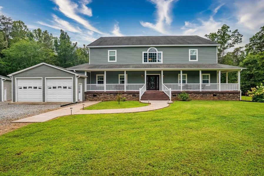 This meticulously constructed custom home is truly a one of a kind. Boasting over 5700 finished sq ft, nestled on almost 20 private acres and a small pond. This home is a dream with its grand foyer, open stair case and railings, massive room sizes, hardwood floors throughout, primary bedroom w/his and her closets, huge bath featuring custom shower, toilet closet, separate sink vanities - one with a dressing vanity, great room area that is wide open from the custom kitchen that includes tons of cabinets, granite and a stone faced island that matches the stone gas fireplace and columns in the den. There are so many upgrades in this home such as the coffered ceiling in the den, the picture frame molding in the dining room, 10 ft ceilings, composite decking on front/side porch and rear deck. There is also an attached 2 car garage and a detached 36 x 40 garage with electricity and 12 ft ceili...