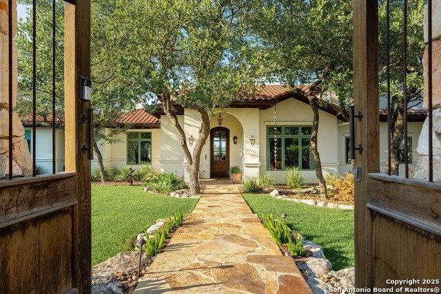 This truly one-of-a-kind property offers exclusive privacy and breathtaking views from every room. Nestled on over 16 AG exempt acres, it combines the luxury of peaceful, rural living with the convenience of being just 10 minutes from La Cantera, The Rim & I10. This home offers an unparalleled living experience in a private, scenic setting. Coming up the drive you are welcomed with a stunning hand-stacked rock wall which leads you to a spacious brick driveway with ample parking. From the moment you arrive, the thoughtful design and attention to detail are evident, setting the tone for the unique and unexpected experience this home has to offer. The home boasts soaring 18-foot ceilings in the main living areas, yet maintains a cozy, welcoming atmosphere. The large living room features one of the home's three fireplaces, with substantial cedar wood-beams lining the ceilings and 8-foot sliding glass doors that open up to spectacular views of the pool and surrounding landscape. The entryway and kitchen area are adorned with gorgeous, hand-troweled groin-vaulted ceilings, adding timeless architecture. Off the kitchen and family room, you'll find another fireplace surrounded by stacked rock, creating a warm and inviting space. The dining room has handmade, 1 of a kind, cement tiles. The expansive kitchen is perfect for entertaining, with top-of-the-line appliances, a prep pantry, and a private bar area. The primary suite is a true retreat, featuring coveted dual bathrooms and closets, each designed to offer unmatched privacy. Both spaces are bathed in natural light and offer serene views of the property. It features beautiful tile that exudes a softness, inspired by the elegant charm of the Marais Rue des Rosiers. Off the primary suite, you'll find a charming study, complete with custom built-in cabinets and a beautifully crafted wood-beamed ceiling. On the other side of the home, there are three additional bedrooms, each with ensuite bathrooms and continuous views. Step outside to discover the incredible 1,200+ square-foot patio with an outdoor living area, fireplace and a sparkling pool with an adjoining spa and a fantastic outdoor kitchen, perfect for dining, entertaining, and savoring the peaceful, picturesque surroundings. Tucked away off the patio is a true gardener's highlight a private garden room & protected exterior garden house. Inviting, understated, and truly one of a kind, this property will be one that you will want to see.