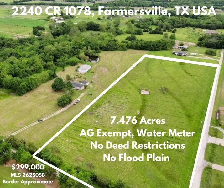Back on the market due to no fault of the Seller. Dual road frontage on CR 1078 & Wagner Trail. Opportunity abounds with this fantastic Farmersville TX USA parcel positioned on 7.476 acres. This is Texas and you have choices, build your new bardo, home, or hold as a development investment. The land boasts a water meter, adjacent electric service, no flood plain, no deed restrictions and is outside of the Farmersville ETJ. Enjoy AG exemption all within Hunt County and the desirable Bland ISD. Location is important and you are minutes to downtown Farmersville, convenient to Greenville and about 40 minutes to McKinney. The soil is mostly Crockett Loam which is rated for moderate faming. A new survey is in hand. Information is deemed reliable; however, Buyer should perform due diligence. Graphic boundary is approximate.
