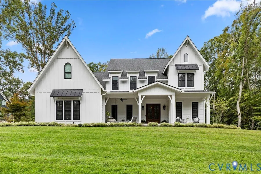 This custom-designed Pacific Farmhouse by Biringer Builders is a masterpiece of craftsmanship & design, blending elevated sophistication with everyday comfort. Situated off of historic Old Gun Road on 2 private acres, the home offers the serenity of a retreat while remaining minutes from conveniences. From the inviting front porch to the welcoming foyer, every detail has been thoughtfully curated. Soaring 10' ceilings, exquisite moldings & wide-plank wood floors establish an atmosphere of refinement. A paneled dining room & butlers pantry provides the perfect setting for gatherings, while the light-filled family room with beamed ceilings, fireplace, and built-ins flows seamlessly to a three-season screened porch with a stone fireplace-ideal for entertaining & relaxation. The chef's kitchen is a true showstopper, featuring a large quartz island with breakfast bar, floor-to-ceiling cabinetry, designer backsplash, luxury appliances, and a sunlit dining area. A walk-in pantry, office/mudroom, powder room and laundry enhance main-level living. The primary suite is a luxurious retreat, wrapped in windows with refined crown molding. The spa-inspired bath offers a double vanity, walk-in shower, private water closet, linen storage, and a boutique-style walk-in dressing room with custom built-ins. Upstairs, a versatile loft connects four spacious bedrooms, including a Jack-and-Jill suite plus a second laundry room with cabinetry. An additional suite with full bath offers flexible space for a media room, office or guest accommodations with expansion potential in the wired storage area. The finished lower level provides abundant living space with a great room, playroom, guest suite and direct walk-out to a private patio. An oversized two-car garage offers excellent storage. Outdoors, the property is designed for both recreation & retreat with a sports field and wooded trails and convenient second stone driveway. This remarkable residence offers a rare opportunity to enjoy elevated living in the heart of beautiful Midlothian.