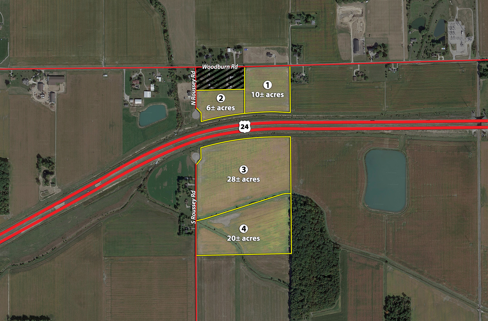 Tract 2: 6± ac This tract has access along N Roussey Rd & the cul de sac there. It lies along US 24. It is level & soils are part Nappanee silty clay to the west & Hoytville silty clay to the east. The water & sewer is nearby along Woodburn Rd to the north. This offers a potential building site or combine with Tract 1 for a complete 16+/- acre site or small farm.