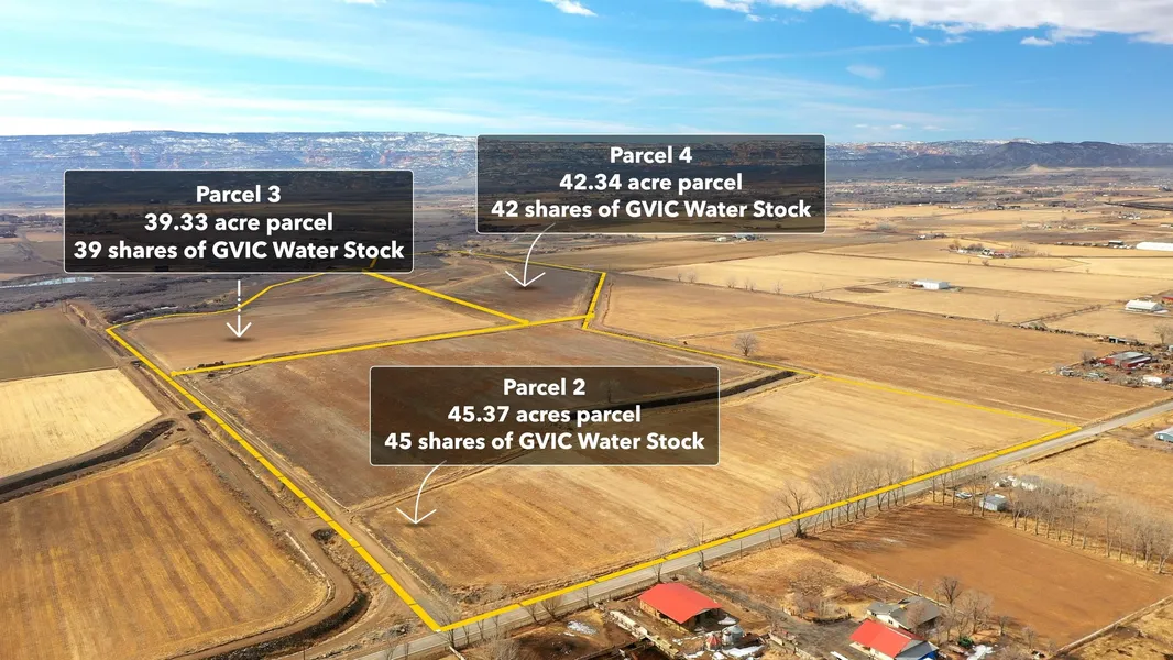 Welcome to O Rd Estates. 3 parcels of farm land are being offered for sale. Lot 2 45.37 acre parcel with 45 shares of GVIC Water Stock and was seeded with Buffalo Brand Equestrian Irrigated Mix last year Lot 3 39.33 acre parcel with 39 shares of GVIC Water Stock Lot 4 42.34 acre parcel with 42 shares of GVIC Water Stock Combination of gated pipe and siphon tubes for irrigation system. Great views in every direction, good farm ground and located just a few minutes from Fruita. For those that are wanting the rural lifestyle and enough land to be able to raise livestock, grow feed and have your own homestead. Close enough to Fruita but far enough away that you are " in the country"