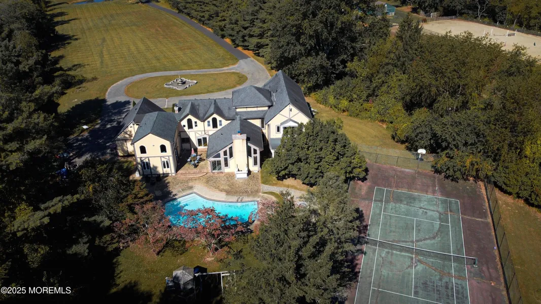 Exquisite Tudor-style estate offering 6,150 sq. ft. on 7.24 private acres along Nina Drive in the highly sought-after Moorestown school district. This exceptional home features a three-car garage, wrap-around driveway with fountain, fenced areas for animals, scenic pond, wooded grounds, in-ground pool, tennis court, fire pit with lighting, private courtyard, and separate carriage house. Inside, enjoy custom wood crown molding, stained-glass windows, a grand two-story foyer, and a floor-to-ceiling stone, wood-burning fireplace in the sunken living room. The main-floor primary suite offers pool access, private sauna, and luxury bath. Additional guest quarters complete this rare retreat. Potential for farmland assessment with proper use.