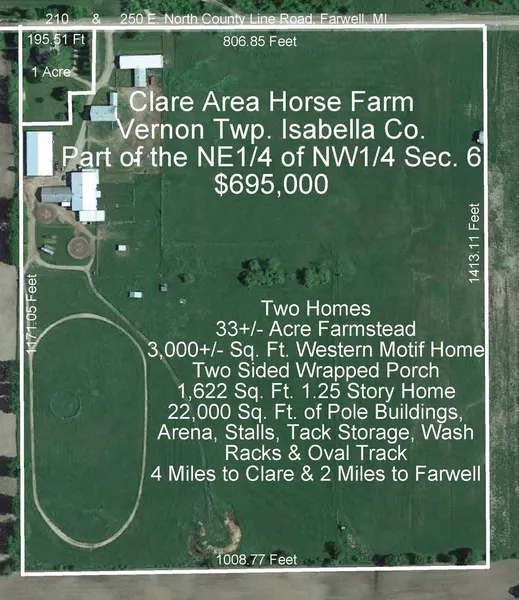 Rural country farmstead of 33 gently rolling acres featuring productive soils, tillable fields, livestock fenced areas, horse barns, stalls, and arena, combined with a really fine and unique Western Motif 3,000 +/- Square Foot Home built into the arena building. This dwelling features a stained log supporting structure with lots of hardwood flooring, ceilings, molding and doors. Tiled where needed in the well appointed kitchen and bathrooms. Maybe the best feature of all is a two sided wrapping covered wood porch with excellent views out onto the fields and pastures, all viewable from an elevated position. To top things off from there, a portion of the dwelling area that is drywalled to the height of two stories could be finished as a garage or two story expansion of the living area. ALSO INCLUDED!! 210 N. County Line Road, 1,622+/- Square Foot 1.25 Story Home currently offered as part of this property. If you can use loads of building space and two good homes, this is well worth looking into!