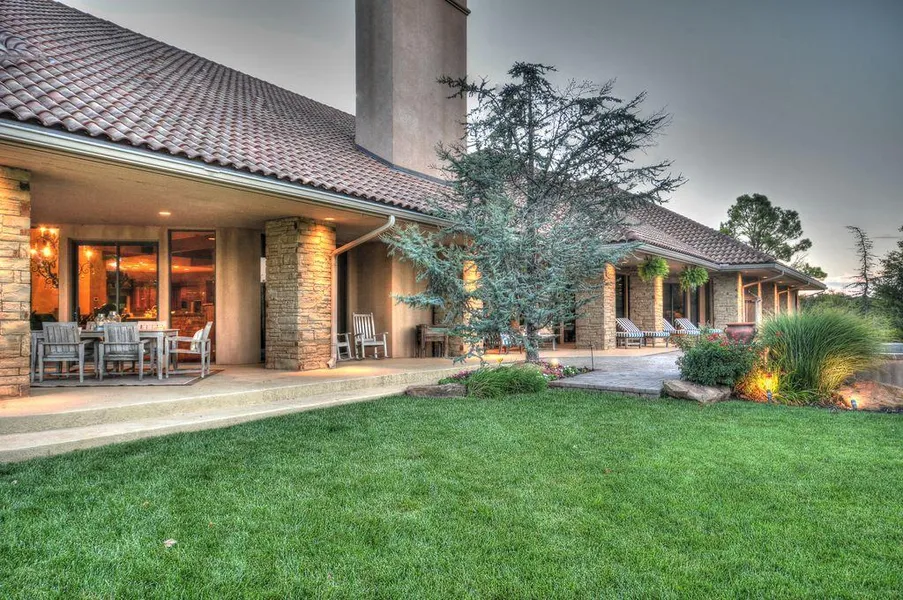 The exterior of the home allows for complete relaxation with a courtyard, partial wrap around porch, and recently renovated heated custom pool with an automatic retractable cover. All which is surrounded by beautiful landscapes, views of the lake and ranch.