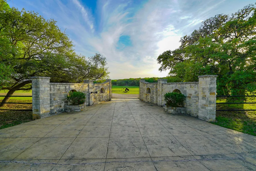 Access: The beautiful stone entrance is directly on Fischer Store Road and includes a decorative iron gate with electric gate for entry.