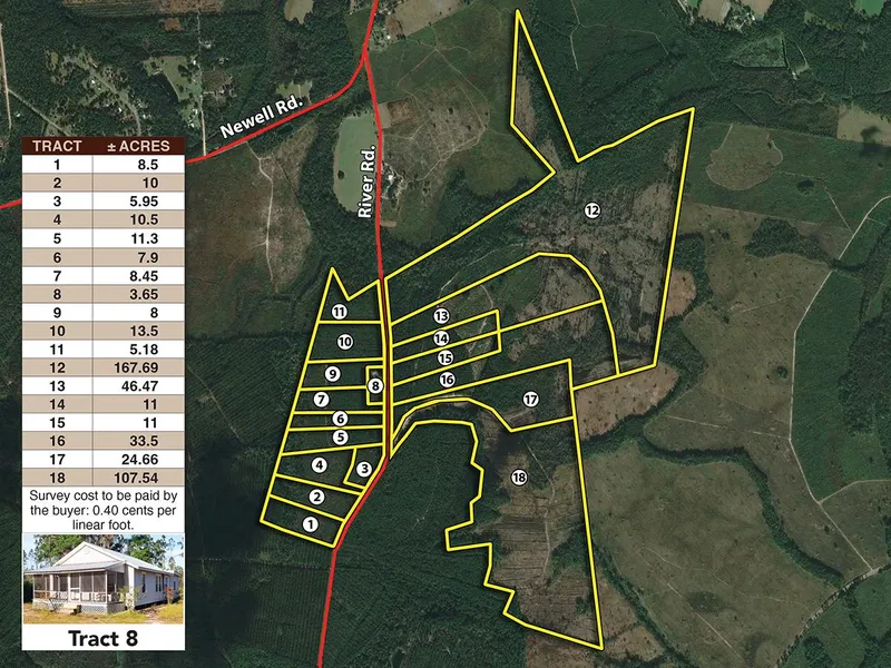 South Auction is proud to present Folkston Farm via online auction. This property is the ideal rural getaway youve been seeking in South Georgia. The tract features mature timber, interior trails, 6000+ ft of paved road frontage, and a 1940s farmhouse. We are offering the property in 18 tracts. These smaller tracts would be great for a mini farm, hunting retreat, and estate home sites. The public can buy single parcels, combinations, or the property as whole. Please read through our information packet and reach out to me with any questions.