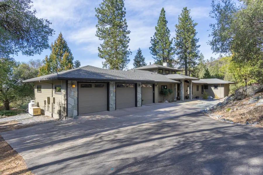 At 2000 feet the home sits above the fog and below the snow, studded with oak and pine trees on 12 acres; well-maintained dirt roads offer easy access around the acreage.