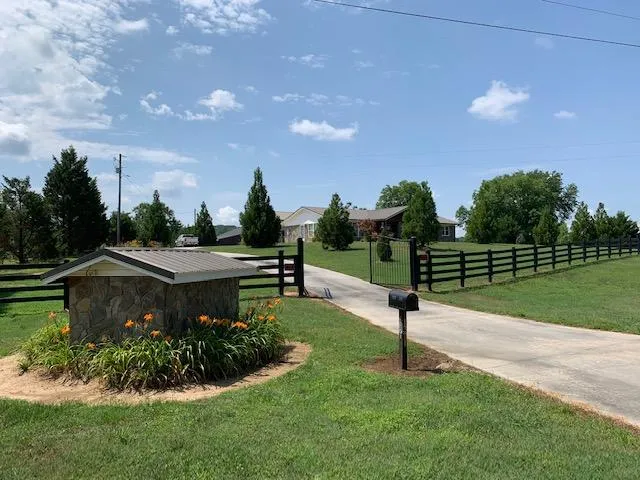 Long, county paved road frontage on Clarks Creek Road with black four board fencing.