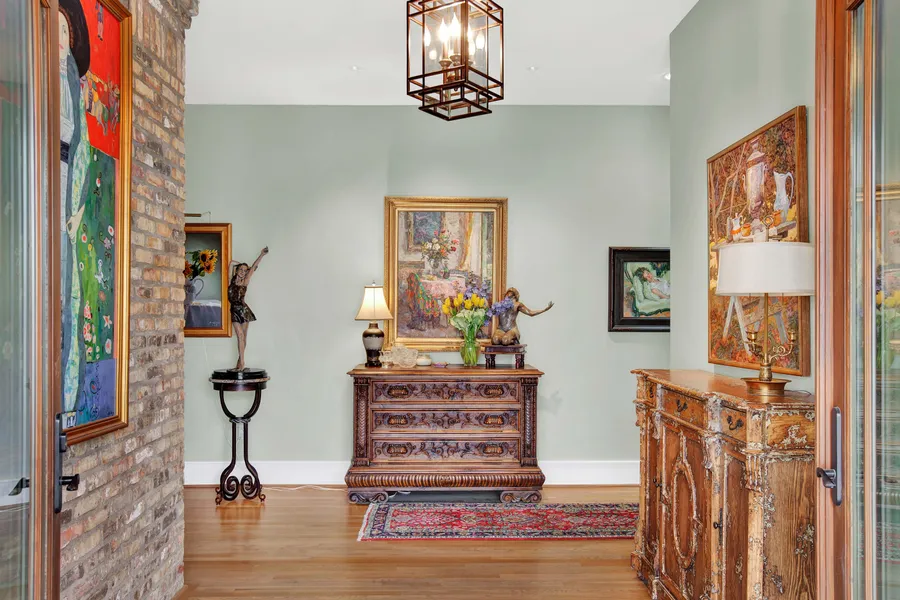 Gorgeous interior living spaces showcase lovely wood floors, interior brick walls, Kingwood custom cabinetry, high ceilings and designer finishes. The premier gourmet kitchen with generous high-grade granite island features a Wolf brand 6 burner gas range, 2 ovens, 2 Bosch dishwashers, warming drawers, 2 Sub-Zero refrigerators, large walk-in pantry & Kingwood custom cabinetry throughout. The light-flooded living area with large gas-log fireplace beautifully accompanies a temperature-control wine vault & glass wall display that will impress the best of wine connoisseurs. The dining area sits directly across from the kitchen and is flanked by beautiful built-in glass cabinetry.