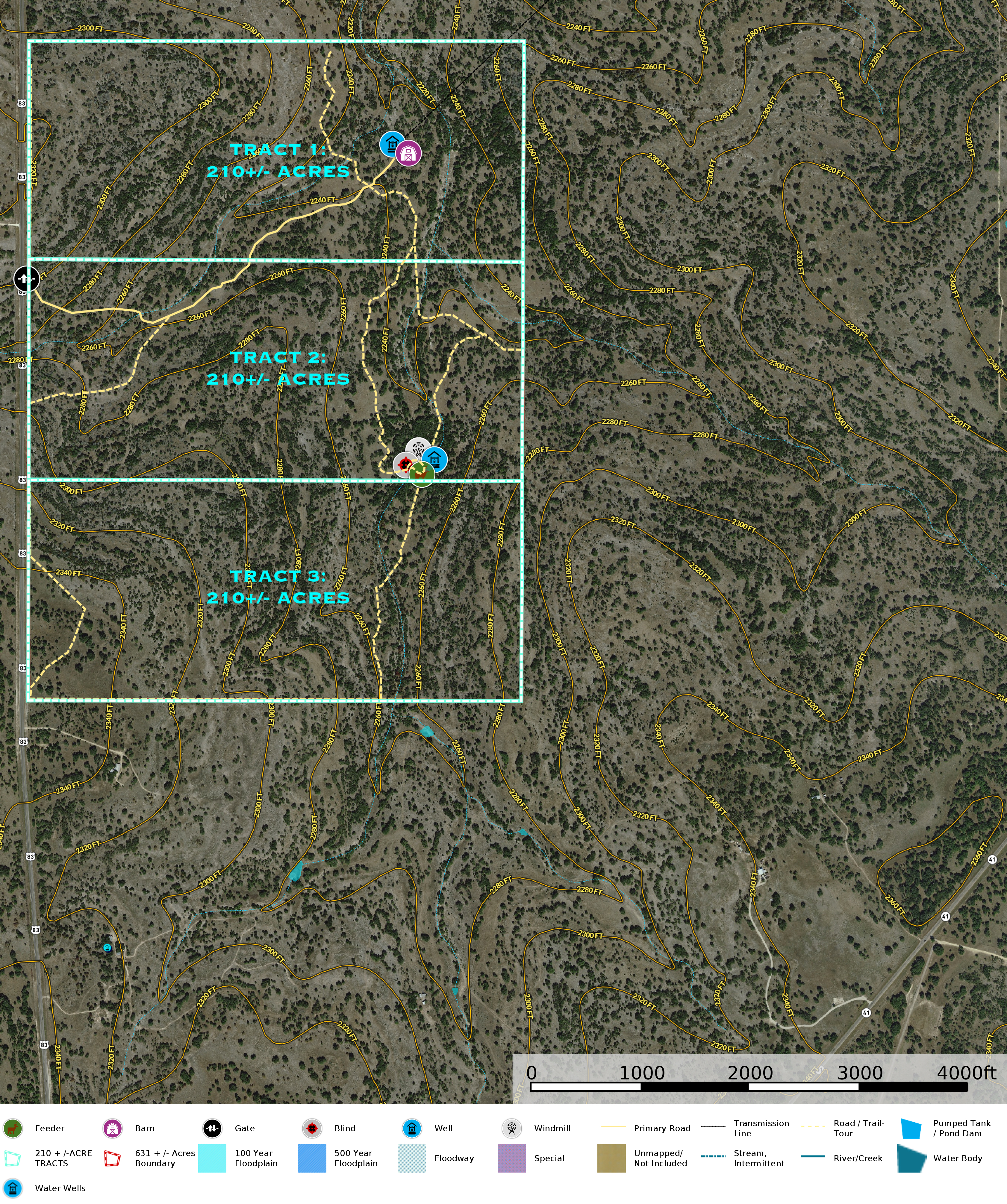 Track 2($11,950/ac): Grand Entry Pipe Gate with welded wire-mesh fencing on Western boundary, all-weather caliche-based interior entry road, and cleared interior trails. Improvements at the rock dam include; a Windmill, Solar powered pump feeding draw filling the pond/tank, game feeder, and a nearby blind.