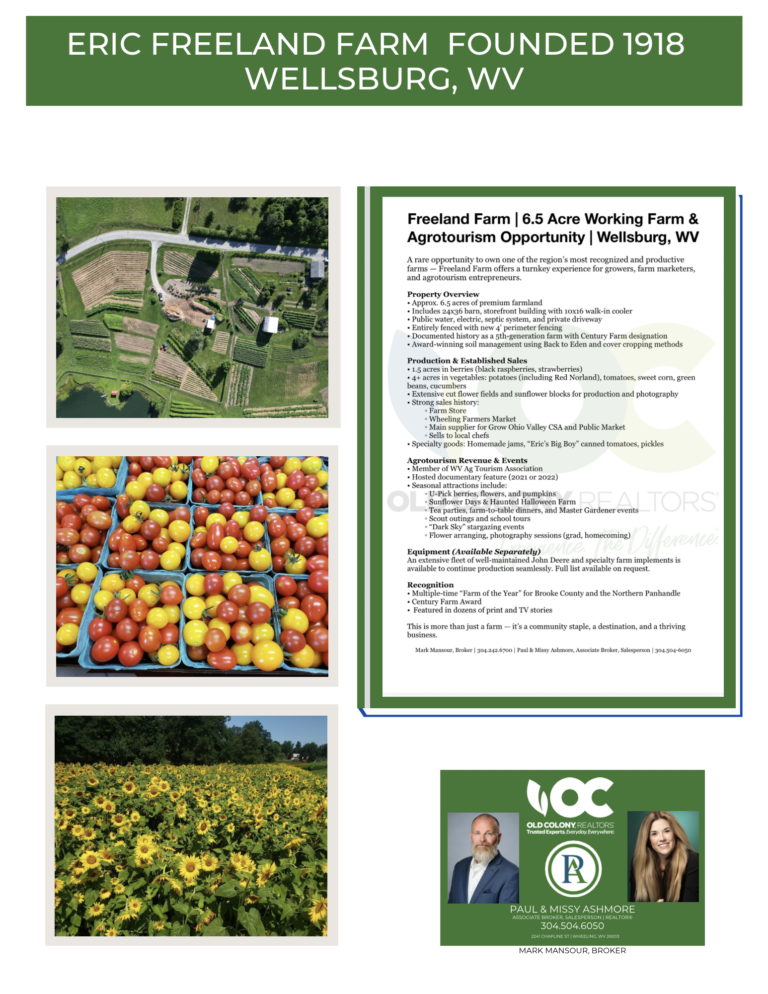 Freeland Farm is a 5th-generation operation with deep community ties and established sales channels. It is a primary supplier for Grow Ohio Valley CSA and Public Market, and sells at the farm store, Wheeling Farmers Market, and to local chefs. High-demand items include strawberries, potatoes, sweet corn, tomatoes, green beans, cut flowers, and a line of homemade jams and canned goods such as the popular “Eric’s Big Boy” tomatoes.