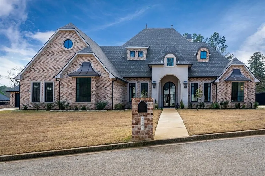 Stunning French Country with a little European flair custom home built in 2023 on a private 0.70-acre lot in Longview ISD. Offering 3,271 sq ft, this 4-bedroom, 2 full and 2 half bath residence features exceptional craftsmanship throughout, including a cast stone front entry, double iron doors, detailed trim work, and premium finishes. The gourmet kitchen boasts inset cabinetry, Quartzite waterfall countertops, KitchenAid appliances, a warming drawer, mini bar, and expansive butler’s pantry. Kitchen offers a huge island with seating and a formal dining area overlooking the pool. Private office just off the kitchen. Primary bedroom is large and has double walk in closets, the en suite offers double sinks, soaking tub and large walk in shower. Courtyard off the primary bathroom offers private sitting area and outdoor shower. Split from the Primary are 2 bedrooms with Jack and Jill style bathroom. Off of the main garage is an upstairs which can be a 4th bedroom or second living area with half bath. Enjoy seamless indoor-outdoor living with a resort-style pool and spa, outdoor kitchen with fireplace, courtyard with outdoor shower, and Sonos sound system. Additional highlights include Pella Reserve and Impervia windows, whole-house spray foam insulation, tankless gas water heater, generator-ready electrical, upstairs guest suite, detached garage or shop, and a 2-car garage. The 2 car extra garage can be used as a shop or extra parking. Thoughtfully designed for comfort, function, and entertaining. Schedule your showing today.