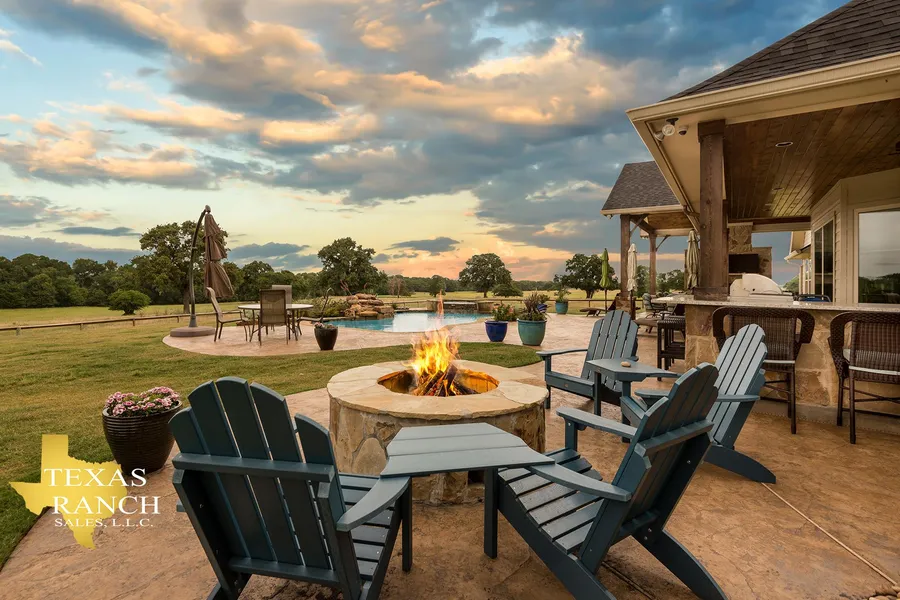 Improvements: The two year old custom designed rock and hardi-sided frame home includes 4800 sf of luxurious interior living and 6400 sf under roof with 4 bedrooms and 4 full baths. The ultimate in modern gourmet kitchens awaits the chef and flows comfortably to a roomy living and dining area. The home boasts the best in high grade granite counters throughout. Spacious bedrooms and baths and a magazine worthy master suite and bath with high tech storage features in the closets are exceptional. An office designed for the executive rancher is another interior highlight. An exercise room, safe room, wine room and I-T room are all special features, as is the bar off the edge of the living area. The interior and exterior living areas have massive floor to ceiling wood burning fireplaces. The covered exterior living area and outdoor kitchen and grilling features are enhanced by well planned seating and lounging by the large outdoor flat screen. The outdoor patio extends to the pool and fountain with fabulous views of the pastures and distant horse stables. The lawns and gardens around the home are meticulously manicured and colorful.