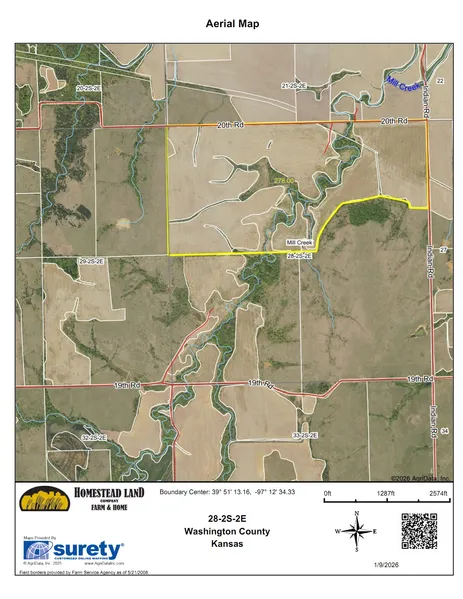 Tract 2: NW 1/4 and part of the NE 1/4, Section 28-T2S-R2E, Washington County, KS. Containing 279.6 acres more or less, less 49% of subsurface mineral rights reserved.