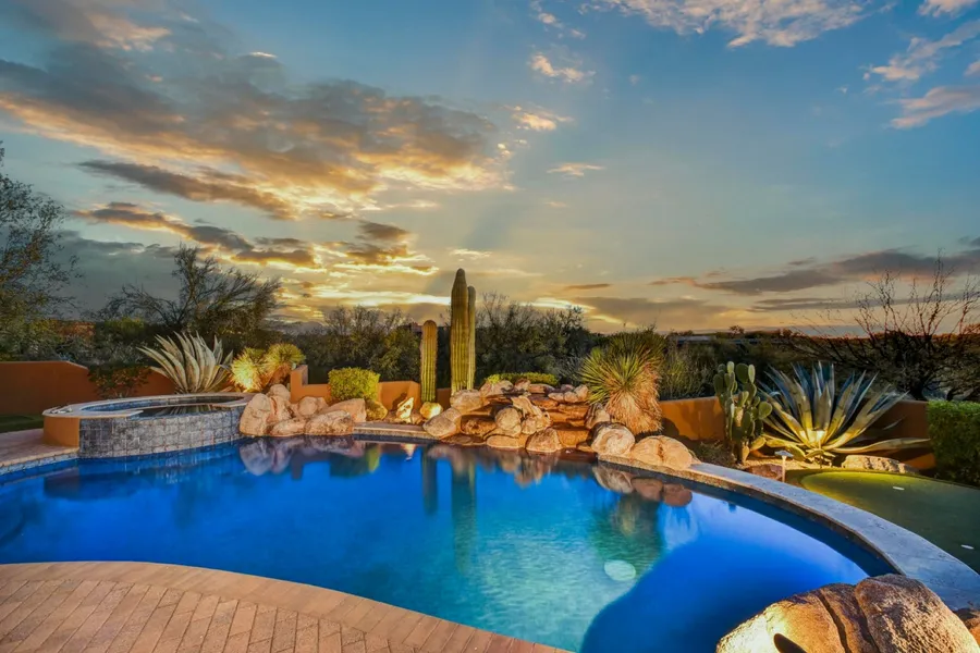 A seamlessly integrated butler's pantry enhances the space, combining modern convenience with elegant design. The bedrooms are tranquil retreats, each adorned with soft linens, rustic wood and stone accents. The primary suite serves as a luxurious haven, complete with a spa-inspired tub and dual vanities for added elegance and comfort. The outdoor living space is equally remarkable, featuring a spacious covered patio perfect for entertaining. Enjoy al fresco dining alongside an inviting pool, spa, and putting green. A built-in grill and comfortable seating create the ultimate setting for gatherings under the stars. With sweeping southwest views and sunsets that stretch for miles! Additionally Lot #61 can be purchased with the home for $800,000 with the same fantastic view corridor.