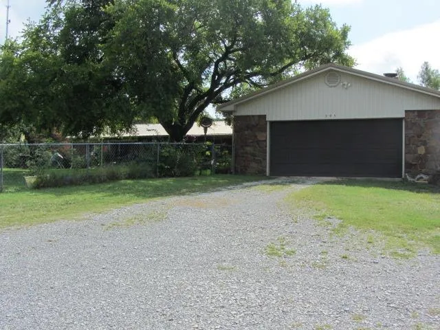 Being one mile off the highway away from traffic noise the location of this total electric rock home is quiet and private.The three ponds have fish, the large detached metal garage has three overhead doors and there are two additional storage buildings. A fenced garden spot is near by.The house has a deck on the back with a view of one large pond and a large covered patio across the front. Inside the two car attached garage is access to the storm cellar. The wood burning fireplace is cozy on cold days. A large family room has a small kitchen area for convenience and sliding doors going out on the covered patio. The spacious laundry room has built in upper and lower cabinets. Yards on two sides of the house are completely chain link fenced. Amount of land will be subject to survey approx.16 acres more or less. For an appointment call: Betty Green 918-448-3479.