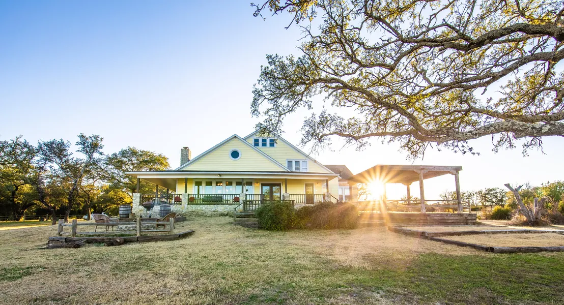 The exterior of the home has a wrap-around porch offering a cool spot of shade for sitting on the porch swings, overlooking the lake and surrounding Bosque County hills. In the evenings enjoy dinner in the wood pergola or gather around the firepit overlooking the lake.