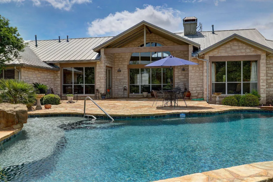 Prestigious gated community, incredible views of the trees and creek. Horses allowed. Backs to greenbelt. Extraordinary design and workmanship. Large RV barn (40' X 60'). Beautiful in-ground pool with waterfall. The seller added the pool and RV barn, new survey may be needed. Call agent to show.