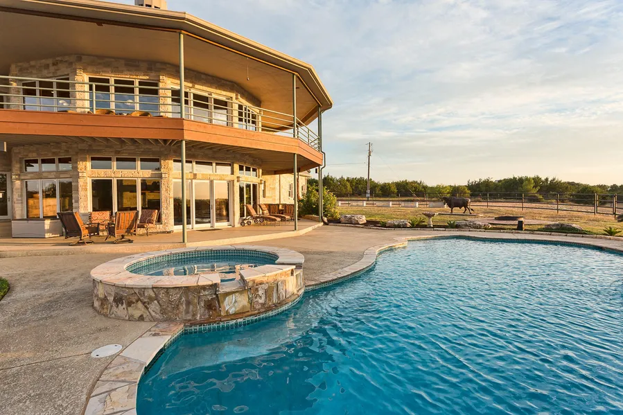 The 4,742 sq ft 3Br 4Bath custom luxury home is situated to take in Hill Country views, and features an open floor plan with windows looking out to the scenic countryside. The home has a great flow to it and is centered by a beautiful see-through stone fireplace. The oversized kitchen opens to the living area, and has commercial grade appliances, multiple sinks, and a breakfast bar area. The master suite has its own fireplace, along with jetted tub, walk-in shower, and dual vanities. The home also has a great wine cellar. There is a surplus of outdoor living, with wrap-around covered porch and balcony overlooking a sprawling patio area featuring a beautiful pool area with waterfall and spa.