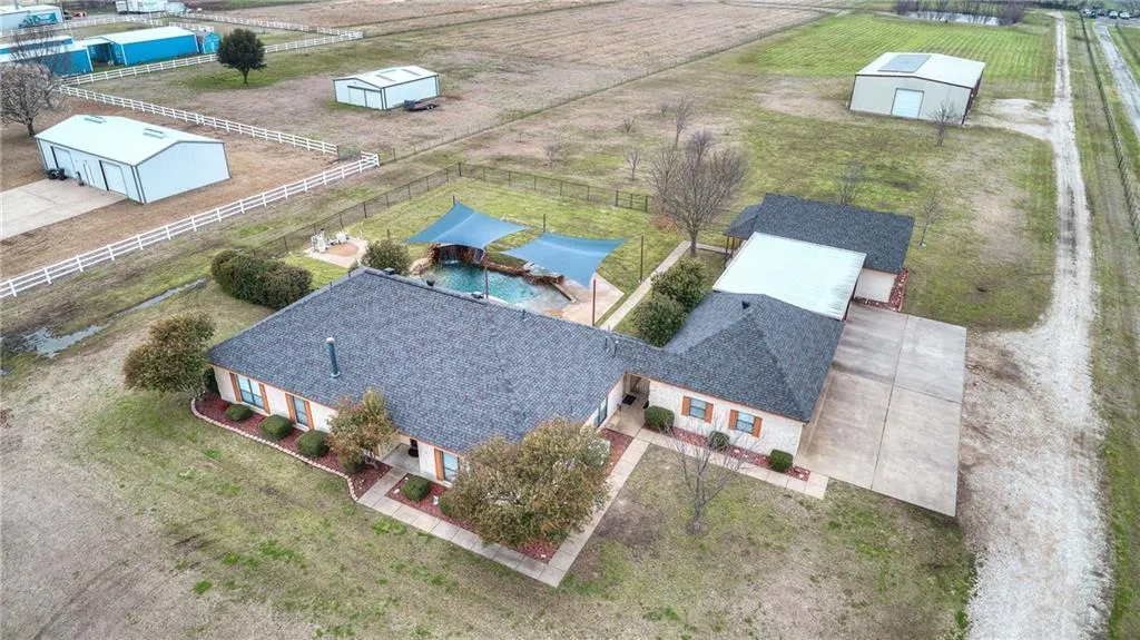 Gentleman's Ranch on 7 acres, just 5 min. to George Bush TPKE & downtown Wylie. Enjoy the room to roam, with all the conveniences of town! Stunning, spacious brick home with great layout ~ which has an incredible Saltwater Pool with spa, slide, waterfall & sails; 936 sq ft guest or pool house with full kitchen (1bdrm,1bath), Dream Workshop ~ car lift, 8 roll-up doors, 220 & etc.; 2 RV hookups; huge landscaped, fenced yard; lots of trees; entire acreage fully fenced for your dogs & fur babies ~ horses permitted; nice pond for fishing; improved pasture; pipe fenced entry,auto gate; & Solar Panel Station (exceptional savings on electric bills). Too many extra's to list ~ book your showing, as this one won't last!