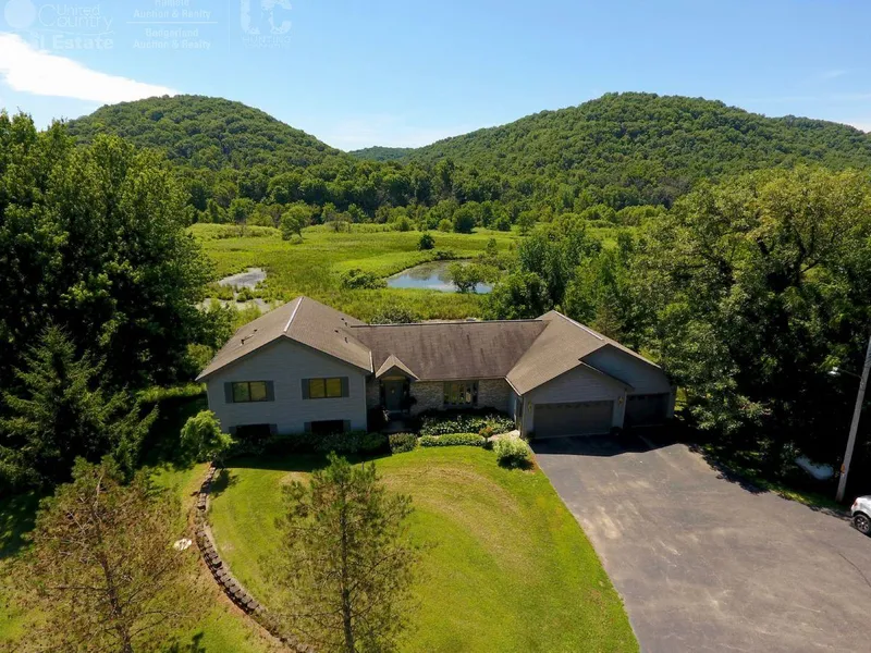 The custom built 3,200sq ft. retreat is nestled amongst awe-inspiring bluffs just over a mile from the Mississippi River. Follow a secluded blacktop road to a picturesque setting that is sure to instantly ease the heart and soul. As you pull into the driveway, youll soon notice that this fairytale estate is in the epicenter of whitetail deer, waterfowl and turkey habitat. Beaten down trench-like deer trails cross the front yard with young pine trees thrashed with buck rubs. You may even startle a flock of ducks taking flight to the River.