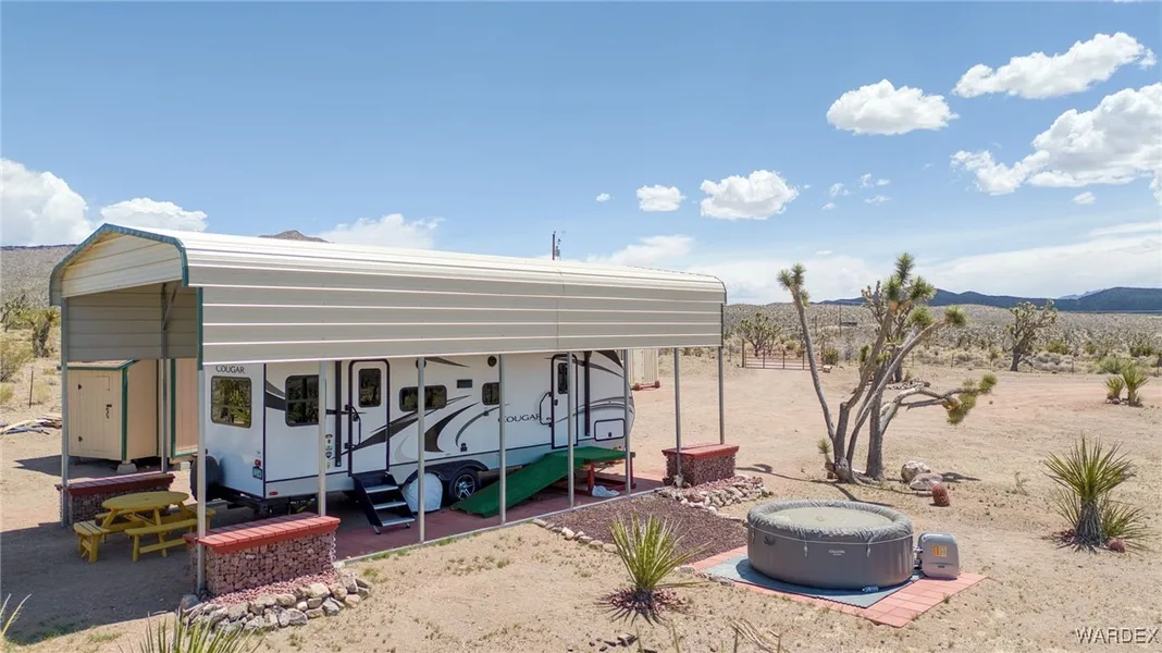 Welcome to 20199 N La Puente Dr, a newly upgraded 1-acre property nestled in the desirable Golden Horseshoe Ranchos Unit 6 of White Hills, Arizona! This spacious lot is loaded with BRAND-NEW features ideal for your desert retreat or basecamp for your Arizona adventures! New Highlights include: an oversized RV/Motorhome Carport, metal front gate with full perimeter fencing, a versatile custom-built 16x10 tiny home/shed with a loft and an attached 12x8 wood deck. The property offers (2) 250-gallon and (1) 180-gallon water tanks, a 6-person inflatable spa, a portable generator, a cement mixer and a 200 amp subpanel with a 50 amp receptacle- plus an additional 30 amp RV hookup. The 2021 Connex container is insulated with power hookup and there is a permitted septic system already in place! Enjoy 360 mountain views, low taxes, a low annual POA fee and scenic backdrops! Whether you're looking to make this your seasonal campsite or your permanent desert destination, this property offers the space and setup to do it all! Everyday essentials are within reach for all your shopping, dining, and recreational needs. Conveniently located just 12 miles from US Hwy 93, this property offers direct access to all major cities including Kingman, Bullhead City, and Las Vegas, as well as nearby towns including Dolan Springs and Boulder City. For outdoor enthusiasts, Lake Mead Temple Bar Marina and Hot Springs is just 30+ miles away for boating, fishing and soaking up the fun! The Grand Canyon West Rim and Lake Mead South Cove Boat Launch are only 75+ miles away offering endless opportunities of adventure. Schedule a private tour with your realtor today!