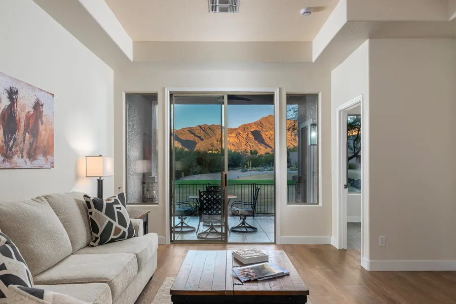 Perched at the third tee box of Sidewinder Golf Course, this exceptional townhome offers panoramic views of the Superstition and Dinosaur Mountains. Designed for easy lock-and-leave living, the home can be sold completely furnished. The HOA features a community heated pool, spa, and exercise room, and covers all exterior maintenance including the roof, which is new. Inside, enjoy 3 bedrooms plus a den and 3.5 bathrooms, including a downstairs bedroom with en-suite bathroom. Recent updates include new flooring throughout, fresh interior paint, new appliances, four new quartz vanity tops, new plumbing and light fixtures, door hardware and more! Tesoro Townhomes HOA makes for great furnished vacation or full time rentals. Wait until you sit on the patio and see the views and watch the golf!