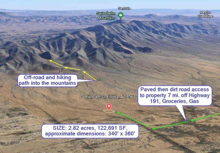 Large 2.82 acre off-grid lot in Elfrida, Arizona zoned R-36 for manufactured homes at the base of Swisshelm Mountain and 12 miles to Leslie Canyon National Wildlife Refuge, with good dirt road access to the property driving on N Wiegand-Pratt Rd. This lot is 115 miles to Tucson and sits at 4,638 ft elevation with mild summers great for camping, off-roading and exploring. There is a gas station, library, auto service shop, grocery store, and restaurants 7 miles away in Elfrida on Highway 191 for all the amenities you need. Have a place to go outside the city for weekend adventures and order today!
