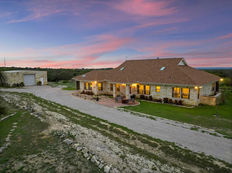 Gorgeous 2,857 square foot home on 7.23 acres with incredible views of the Texas Hill Country. This home offers convenient, single-story living with 3 beds, 2.5 baths, an office, formal dining, a breakfast nook, and a 30x40 foot detached workshop with 9 foot roll up door, as well as additional covered parking attached to the house. The primary suite boast beautiful views from a private screened in porch, as well as a large walk in closet with custom built ins galore. Enjoy a piece of country living in an equestrian friendly, gated-community that offers an abundance of privacy. Conveniently located 15 minutes from Johnson City wineries and 15 minutes from historic, Marble Falls. Being just outside the 281/71 growth corridor, makes this the perfect time to buy this property, as convenient shopping develops nearby.