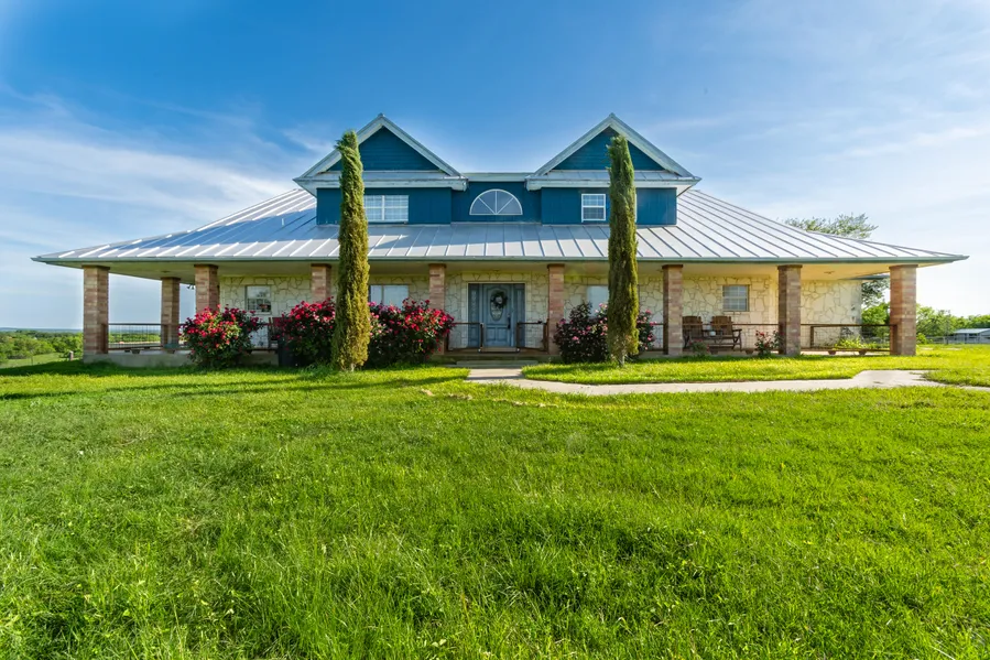 Gorgeous contemporary hill-country style home on almost 40 acres (No Restrictions)! 5 bedrooms/4 bathrooms with updated master and bath located on the main floor. Large updated kitchen with center island opens up to one of two spacious dining rooms. This house offers a great floorplan and open concept living room with views all the way to the second floor. Includes a gorgeous wrap around porch, in ground pool with stunning views, cattle ramps, and giant metal garage including storage space & 6 horse stalls.
